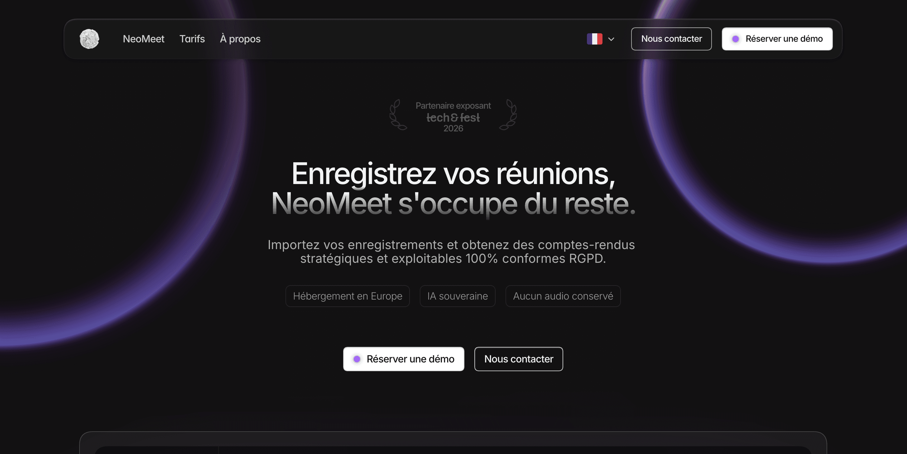 Le site a été conçu pour faire émerger dès les premières secondes les piliers du produit : conformité RGPD, confidentialité des données et performance. Le copywriting existant fourni par Neova a permis de structurer un parcours clair, orienté décision, mettant en avant à la fois les bénéfices métier et des aperçus de l’interface du dashboard. Le parcours utilisateur vise à positionner NeoMeet comme l’outil le plus fiable et souverain pour clarifier les réunions, faire gagner du temps aux équipes et sécuriser les échanges sensibles. L’action principale du site est la prise de rendez-vous pour une démonstration, soutenue par une action secondaire de prise de contact, pensée pour les visiteurs nécessitant davantage de réassurance avant de s’engager.